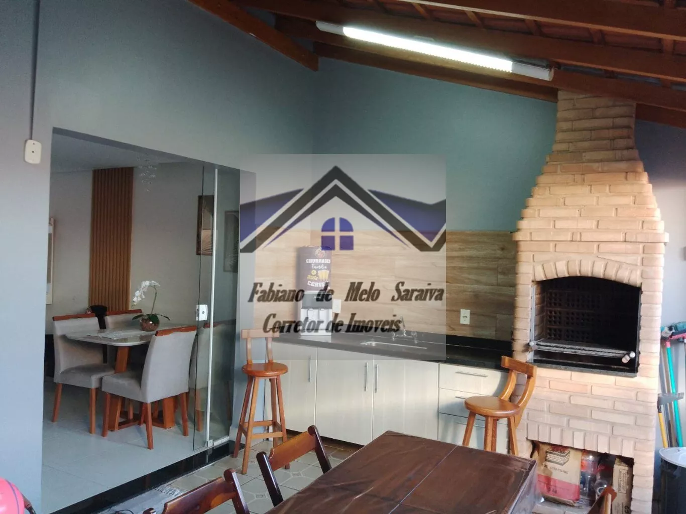 Sala de jantar integrando, estar e área da churrasqueira.