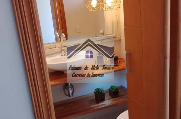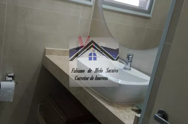 Banheiro recém reformado todo em porcelanato, cuba sobreposta, teto rebaixado com iluminação embutida, box blindex e nicho e pia em pedra mármore travertino.