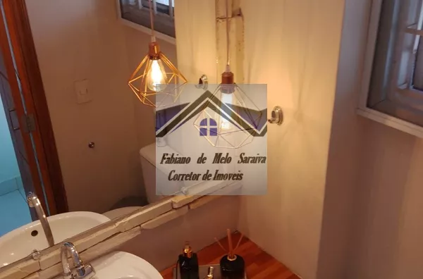 Parte de baixo com teto todo rebaixado com iluminação embutida, lavabo rústico com iluminação pendente.